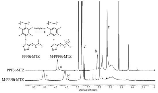 For the quaternization of PPFSt-MTZ, the tertiary amine groups were methylated using iodomethane (see Figure 1). The methylation of tertiary amines with a large excess of iodomethane for complete quaternization has been widely used for anion exchange membrane preparation [23,24,25,26]. The 1H NMR spectra of both PPFSt-MTZ and M-PPFSt-MTZ are shown in Figure 3. The CH3 signal of PPFSt-MTZ on nitrogen was observed at 2.16 ppm. After methylation, the CH3 signal had shifted completely to 3.28 ppm due to the de-shielding from the quaternized nitrogen, indicating complete quaternization by iodomethane.