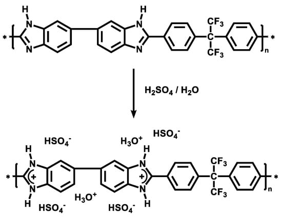 The protonation of partially fluorinated and highly stable polybenzimidazole (F6-PBI) when doped with sulfuric acid [31].