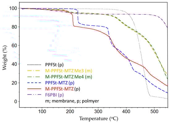 The details of the preparation and the properties of the blend membranes are presented in Table 1. Firstly, the blend membranes were prepared by using 90 wt. % and 80 wt. % of M-PPFSt-MTZ (M-PPFSt-MTZ-Me 1 and M-PPFSt-MTZ-Me 2, respectively), and 10 wt. % and 20 wt. % of F6-PBI, respectively. However, the membranes were found to be mechanically unstable after solvent evaporation and broke into pieces (see Figure S2 and Table S2 in the supporting information), probably due to the strong intermolecular hydrogen bonding and dipole-dipole association of the highly functionalized with charged functional groups of PPFSt. In the literature, a similar polymer bearing tetrazole as a functional group has been reported to form mechanically stable membranes at a low functionalization degree [17]. Therefore, it is thought that the mechanical stability of membranes can be improved by decreasing the degree of functionalization or increasing the molecular weight of the PPFSt [27,28]. This issue will be addressed in future work. Another approach to improving mechanical stability entails the addition of a polymer that possesses good film-forming properties and stability. Thus, blend membranes were prepared by blending M-PPFSt-MTZ with polybenzimidazole (F6-PBI) containing 70 wt. % and 60 wt. % of M-PPFSt-MTZ in the blend membrane (M-PPFSt-MTZ-Me 3 and M-PPFSt-MTZ-Me 4, respectively; see Table 1). This gave us access to mechanically stable blend membranes based on the newly obtained M-PPFSt-MTZ.