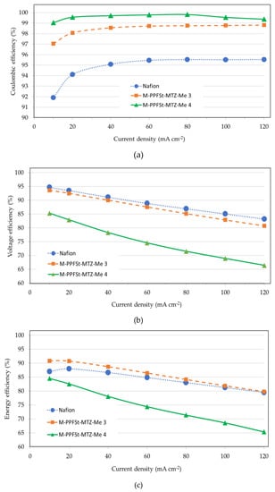 Voltage efficiencies (VEs) are governed by the ohmic resistances between two electrodes, which are mainly affected by the membrane resistance, corresponding to its ionic conductivity [35]. As shown in Figure 6b, the Nafion membrane showed the highest VE irrespective of the current density, correlating with its highest conductivity among the membranes tested in this study. On the other hand, the M-PPFSt-MTZ-Me 4 showed the lowest VE, in line with its lowest conductivity among all of the membranes tested in this study.
