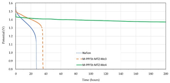 Open circuit voltage (OCV) measurements can be used to indirectly measure the vanadium ion cross-over [36], as the cross-over through the membrane results in self-discharge, which corresponds to a OCV drop in the performance of the VRFB [37]. Thus, self-discharge was monitored as a function of time. As seen in Figure 7, the OCV when using M-PPFSt-MTZ-Me 4 membranes remained nearly stable for over 200 h, indicating a low vanadium ion cross-over, as expected. When using Nafion212 in the VRFB, a fast self-discharge time of 27 h was observed, due to fast cross-over. A VRFB with the M-PPFSt-MTZ-Me 3 membrane showed a slightly longer self-discharge time of 35 h, compared to that with Nafion. It is clear that the results of the OCV measurements are in accordance with the results obtained from the CE test.