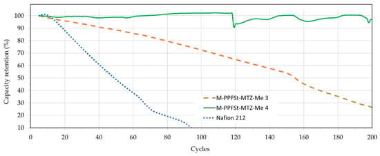 Charging-discharging cycling performance, with operation at a constant current density of 40 mA/cm2 for both the charging and discharging of the blend membranes, was measured and compared with Nafion212 (Figure 8). It must be remembered that some capacity decay is inevitable during cycling tests, due to the different permeabilities of the four vanadium ion states, as well as the water transfer between electrolytes through the membrane [38,39]. While this capacity decay can be restored by simply remixing the two electrolytes [40], this will add to the cost of maintaining the VRFBs. Thus, capacity retention is one of the most critical parameters in determining the success of a VRFB’s application. As seen in Figure 8, the VRFB with Nafion showed a fast decay in capacity, with most of its capacity lost in less than 100 cycles. By contrast, the VRFB with the M-PPFSt-MTZ-Me 3 membrane showed a much better capacity retention, with an 80% loss over 200 cycles, confirming considerably less vanadium ion cross-over. As in the previous experiment (CE and OCV), the VRFB with M-PPFSt-MTZ-Me 4 showed the highest capacity retention, again confirming both its chemical and mechanical stability and consistently low vanadium ion cross-over rate.