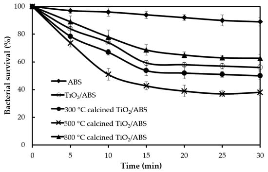Bacterial survival following photocatalytic reaction of ABS, TiO2/ABS and 300–800 °C calcined TiO2/ABS (TiO2 concentration of 1 wt %).