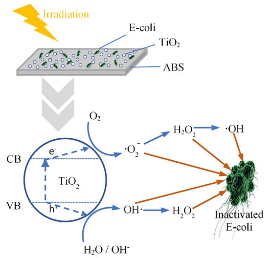 Thermoplastic polymers are widely used for appliances such as sanitary ware, medical appliances, furniture and children’s toys due to their favorable properties, such as excellent impact resistance, good machinability and excellent aesthetic qualities []. Durable plastics with a useful life of three years or more, such as Acrylonitrile-Butadiene-Styrene (ABS) plastics, could be potentially colonized by myriad microorganisms. Therefore, one of the biggest problems these plastics pose is microorganism contamination, including viruses, fungi and bacteria, which are harmful to the environment, hazardous to humans, and are difficult to disinfect. The generated reactive oxygen species (ROS) play a crucial role in bacterial disinfection. ROS can be generated by light irradiation or, more recently, by harnessing the power of microwaves using a conventional microwave oven [,].