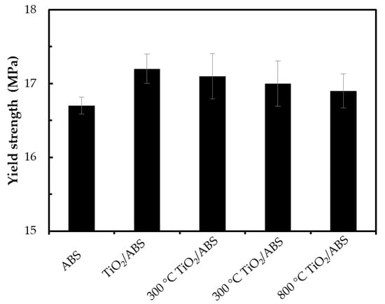 Yield strength of ABS, TiO2/ABS and 300 °C–800 °C-calcined TiO2/ABS (TiO2 concentration of 1 wt %).
