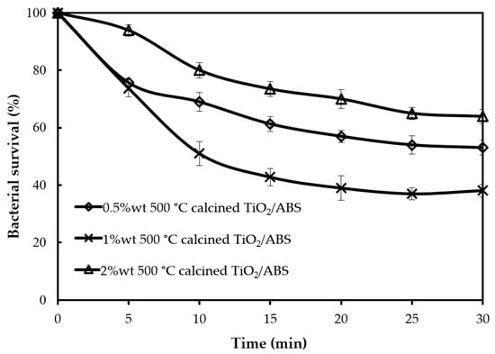 The previous section demonstrates that optimum performance on photocatalytic performance occurred at 500 °C for calcined TiO2/ABS. In this section, the influence of 500 °C-calcined TiO2 concentration in ABS on photocatalytic performance was considered. From the 40% bacterial survival by 1 wt % calcined TiO2/ABS, changing of TiO2 concentration had been considered, as shown in Figure 6. The reduced concentration of TiO2 resulted in the increase of bacterial survival by 50 ± 2.2%. This indicated that the smaller amount of TiO2 was not enough to produce OH radicals and reactive oxygen species (ROS) to inactivate the bacteria. However, by increasing the concentration to 2 wt %, the bacterial survival increased to 70 ± 2.5%. This showed that presence of large amounts of TiO2 did not always lead to the high photocatalytic activity, but may in fact suppress the activity due to their aggregation.