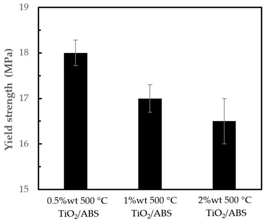 Yield strength of ABS with 500 °C calcined TiO2 at different concentrations.