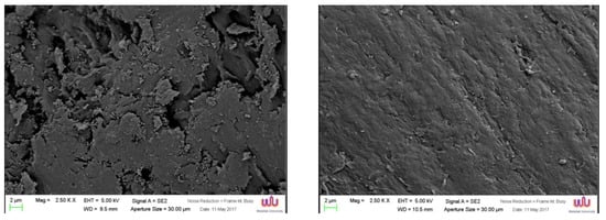 The influence of silane on TiO2/ABS was observed in the SEM images shown in Figure 8, in which the 500 °C-calcined TiO2/ABS without silane possessed rough surfaces and smaller particles on the ABS surface, as illustrated in Figure 8a. After mixing silane, the morphology of blended polymer in Figure 8b shows the presence of a smooth surface and better dispersion, rather than TiO2/ABS. The difference was attributed to a greater interactions with the polymer matrix, which silane coupling agent showed the compatible behaviour of ABS/TiO2 by creating more adherent bonding between TiO2 and ABS matrix, as similarly explained for the modified SiO2 with silane [,,].