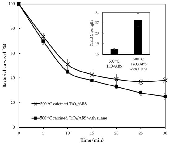 Bacterial survival by photocatalytic reaction of ABS with 500 °C calcined TiO2 (1 wt % loading) with and without silane and corresponding their yield strength (inset).