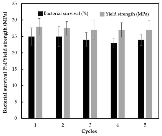 Reusability of ABS with 500 °C calcined TiO2 (1 wt % loading) with silane grafting up to the 5th cycle in terms of bacterial survival by photocatalytic reaction, and the yield strength of the material (photo irradiation time of 30 min for each cycle).