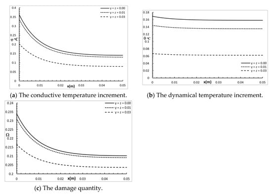 Figure 2 shows the conductive temperature distribution, the dynamical temperature distribution, and the thermal damage distribution for a wide range of values on the x-axis and at various positions of y and z . The values of both y and z have significant effects on all the studied functions, and increasing the values of y and z causes a decrease in the values of all the studied functions. The values of the conductive temperature increment on the bounding plane of the surface were = 0.36 °C = 0.34 °C, and = 0.20 °C. The values of the dynamical temperature increment on the bounding plane of the surface were = 0.17 °C = 0.145 °C, and = 0.068 °C. Thus, the values of the dynamical temperature increment were smaller than the values of the conductive temperature increment in the same positions. The values of the damage quantities on the bounding plane of the surface were , and .