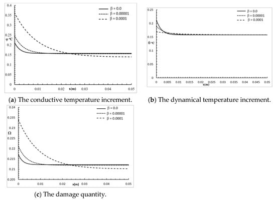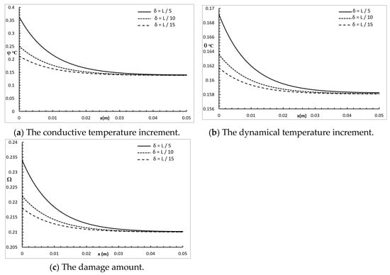 Figure 4 represents the conductive temperature increment, the dynamical temperature increment, and the damage distribution for a wide range of values on the x-axis and various values of the penetration depth parameter when and . The penetration depth parameter had a significant effect on all the studied functions. Increasing the value of the penetration depth parameter caused an increase in the value of the conductive temperature increment, up to the position , and after that, the three cases were highly similar. Increasing the value of the penetration depth parameter caused an increase in the value of the dynamical temperature increment up to the end position . Increasing the value of the penetration depth parameter caused an increase in the value of the damage amount up to the position , and after that, the three cases were highly similar.