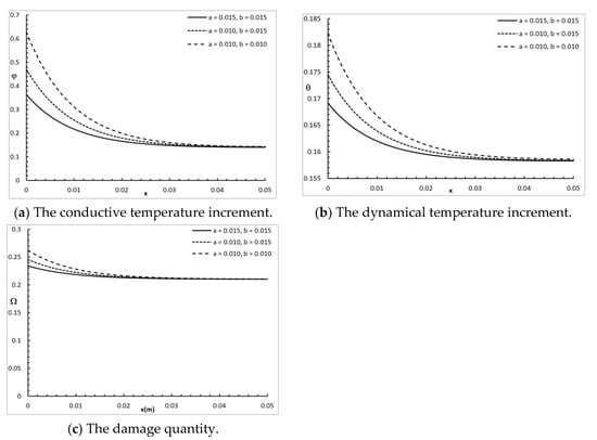 Figure 5 shows the conductive temperature increment, the dynamical temperature increment, and the damage amount distribution for a wide range of values on the x-axis and various rectangular laser pulses , when and . The dimensions of the rectangular laser pulse had a significant effect on the conductive temperature increment, the dynamical temperature increment, and the damage amount distribution. Increasing the values of and decreased the value of the conductive temperature increment up to the position , and after that, the three cases were highly similar. Increasing the values of and decreased the value of the dynamical temperature increment up to the position , and after that, the three cases were highly similar. Increasing the values of and decreased the value of the damage amount up to the position , and after that, the three cases were highly similar.