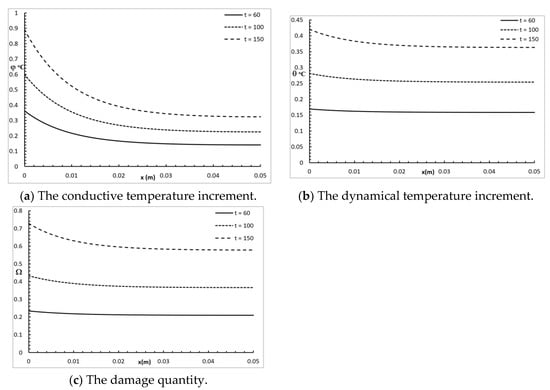 Figure 6 represents the conductive temperature increment, the dynamical temperature increment, and the damage amount distribution for a wide range of values on the x-axis and various values for the time when . The time had a significant effect on the conductive temperature increment, the dynamical temperature increment, and the damage amount distribution. Increasing the value of the time caused an increase in the conductive temperature increment, the dynamical temperature increment, and the damage amount distribution up to the end .
