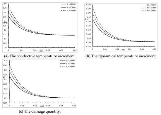 Figure 7 shows the conductive temperature increment, the dynamical temperature increment, and the damage quantity distribution for a wide range of values on the x-axis and various times × 103 W/m2, when and . The power density of the laser pulse had a significant effect on the conductive temperature increment, the dynamical temperature increment, and the damage amount distribution. Increasing the power density of the laser pulse caused an increase in the values of the conductive temperature increment up to the position , and after that, the three cases were highly similar. Increasing the power density of laser pulse caused an increase in the values of the dynamical temperature increment up to the position , and after that, the three cases were highly similar. Increasing the power density of the laser pulse caused an increase in the values of damage amount up to the position , and after that, the three cases were highly similar.