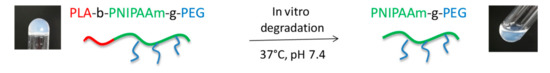 Description of the approach based on PLA-b-PNIPAAm-g-PEG, with PLA as a “sacrificial” block. PLA: polylactide, PNIPAAm: poly(N-isopropylacrylamide, PEG: polyethylene glycol.