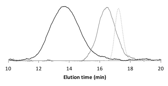 Size exclusion chromatography (SEC) analysis (in N,N-dimethylformamide (DMF)) of the (co)polymers along synthesis process. From right to left: poly(ethylene glycol) methacrylate (PEGMA) (grey dotted line): Mn(SEC) = 3900 g·mol−1, Đ = 1.06; PLA-SG1 (grey line): Mn(SEC) = 5700 g·mol−1, Đ = 1.36; PLA-b-P(NIPAAm-PEGMA) (black line): Mn(SEC) = 46,000 g·mol−1, Đ = 1.9.
