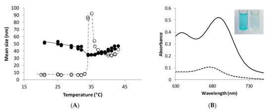 Aqueous solution behavior of the copolymers in phosphate buffer saline (PBS) (0.1 wt. %): (A) size (from dynamic light scattering (DLS)) vs. temperature for PLA-b-P(NIPAAm-co-PEGMA) (●) and P(NIPAAm-co-PEGMA) (○); (B) UV-visible spectrum of cy5.5 incubated at room temperature with copolymer solutions (Cy5.5: 3.3 µg·mL−1, copolymer: 1°mg·mL−1 (0.1 wt. %) in PBS): PLA-b-P(NIPAAm-co-PEGMA) (back line, left photograph) and P(NIPAAm-co-PEGMA) (dotted line, right photograph).