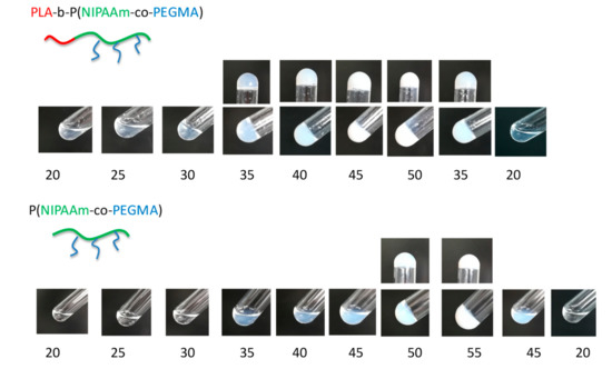 Hydrogel formation vs. temperature (copolymer at 15 wt. % in PBS) through inverted tube method: PLA-b-P(NIPAAm-co-PEGMA) (top) and P(NIPAAm-co-PEGMA) (bottom).