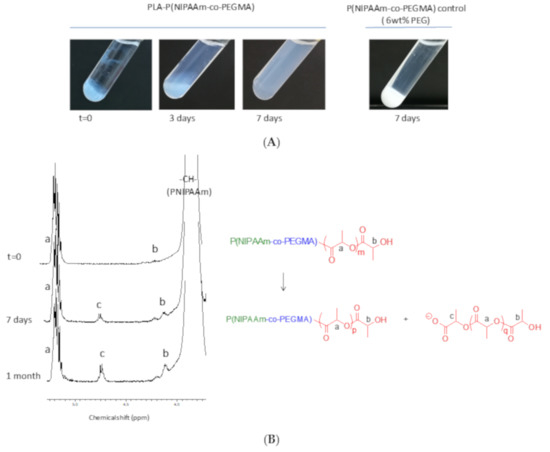 In vitro degradation (PBS, pH 7.4, 37 °C) of PLA-P(NIPAAm-PEGMA) hydrogel, assessed visually (A, photographs) and quantitatively (B, 1H NMR in deuterated dimethyl sulfoxide (DMSO-d6)).