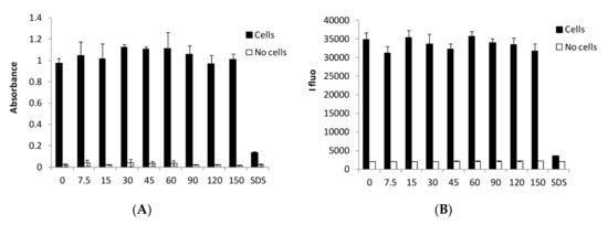 Cytotoxicity of the PLA-b-P(NIPAAm-co-PEGMA) copolymer towards dendritic cells (DC 2.4) at various concentrations (7.5 to 150 µg·mL−1) assessed by MTT (A) and Presto Blue (B) assays. “0” means no polymer (signal of cell alone is the one on which the results are normalized to calculate cell viability). Sodium dodecyl sulfate (SDS) (right) was used as a toxic positive control.