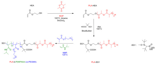 The synthesis of the PLA-b-PNIPAAm-g-PEG copolymer (referred to as PLA-b-P(NIPAAm-co-PEGMA) in the rest of the paper) relied on a combination of ring-opening polymerization (ROP) and nitroxide-mediated polymerization (NMP). In the first step, an acrylate-terminated PLA (PLA-HEA) was obtained by performing ROP of LA from 2-hydroxyethyl acrylate (HEA) as the initiator in the presence of SnOct2 as the catalyst. Then, the BlocBuilder alkoxyamine was added onto the acrylate double bond of the PLA-HEA through intermolecular radical addition (IRA). This step yielded a PLA-SG1 macroalkoxyamine, able to initiate the NMP of NIPAAm and PEGMA, leading to the formation of PLA-b-P(NIPAAm-co-PEGMA) copolymer (Scheme 1).