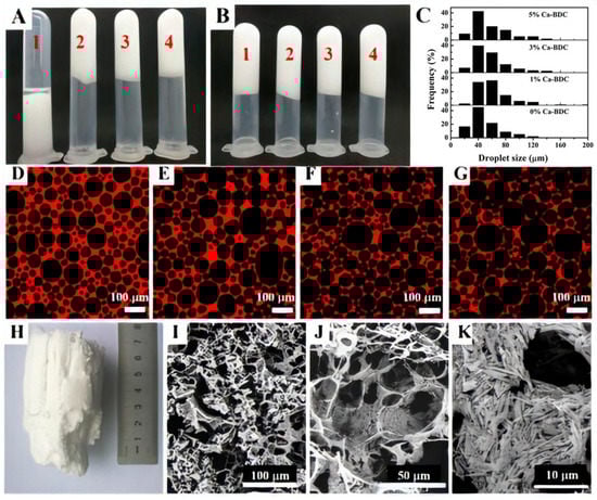 (A) Calcium-terephthalate (Ca-BDC) solely emulsified oil-in-water (O/W) high internal phase emulsions (HIPEs) (1), (2), (3), and (4) containing 1, 3, 5, and 7 wt % of Ca-BDC in absence of polyvinyl alcohol (PVA), respectively; (B) Ca-BDC particles co-stabilized O/W HIPEs (1), (2), (3), and (4) containing 0, 1, 3, and 5 wt % of Ca-BDC in presence of PVA, respectively; (C) is the droplets size distribution chart; (D), (E) and (F), (G) are the confocal laser scanning microscopy (CLSM) images of Ca-BDC co-stabilized O/W HIPE (1), (2), (3), and (4); (H) is the photograph of integral 3D PVA-modified Ca-BDC monolith templated from Ca-BDC co-stabilized CO2-in-water (C/W) HIPE in the presence of PVA; (I) and (J) are the SEM images of the microstructure of integral 3D PVA-modified Ca-BDC monolith; (K) is a magnified view of (J) to show the separated ultra-fine Ca-BDC nano-rods.