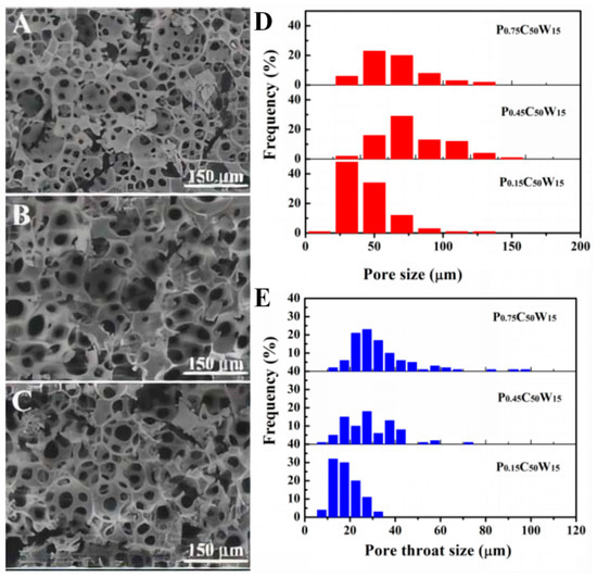 The SEM images (A), (B), and (C)of PxC50W15 templated from C/W HIPEs containing 0.15, 0.45, and 0.75 g Ca-BDC, respectively; (D) and (E) are the distribution charts of pores and pore throats, respectively, which were measured and counted from corresponding SEM images.