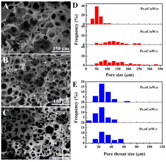 The SEM images of (A), (B), and (C)of P0.45C50Wz templated from C/W HIPEs containing 12, 15, and 20 mL aqueous solution, respectively; (D) and (E) are the distribution charts of pores and pore throats, respectively.