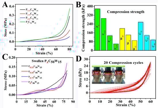 Commonly, polyHIPEs porous materials are designed necessarily to offer adequate mechanical support according to practical applications. The typical performances of the polyHIPEs (tested as freshly obtained, i.e., 3 g specimens contains about 2 g H2O) in the three processes of compression test are shown in Figure 6 (insert) and the Video. All of polyHIPEs exhibiting excellent compression resistance can regain their original size after removal of compression stress. Corresponding compression strain–stress curves were plotted in Figure 6A and Figure S3. All of the curves consist of three linear regions with increasing positive slopes, which are characteristic of open-cell flexible polymer foams [44]. When the strains reach 80%, most compression strengths of as-prepared polyHIPEs are within a range of 70 kPa to 319 kPa (Figure 6B). Additionally, swollen porous composites of PxC50W15 with water were also carried out to test compression strain–stress behavior. Results came out that these polymer composites also have partial mechanical strength (Figure 6C), which can endow them certain mechanical support for applications of bio-tissue engineering and drug delivery.