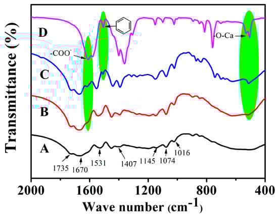The FT-IR spectra of (A) P0C50W15, (B) P0.75C50W15, and (C) P3C50W15, (D) as-synthesized Ca-BDC.