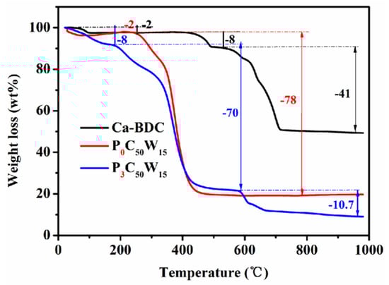 The TG curves of Ca-BDC, P0C50W15 and P3C50W15 templated from C/W HIPEs containing 0 and 3 g Ca-BDC, respectively.