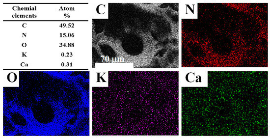 The surface chemical compositions of porous material are crucial for its application. Mapping images of the pore surface of Ca-BDC/PolyHIPE were obtained to determine the distribution of every element. As shown in Figure 10, excepting the C, N, K, and O, Ca element is distributed uniformly on the composite pore surface. These results are also in agreement with the SEM images in Figure 2, where the Ca-BDC particles were well-dispersed on the surfaces of the pores or embedded into the pores wall, demonstrating that Ca-BDC was dispersed uniformly into Ca-BDC/polyHIPE, which is critical for Ca-BDC to behave their bio-functions, and partially proved the emulsifying role of the Ca-BDC particles.
