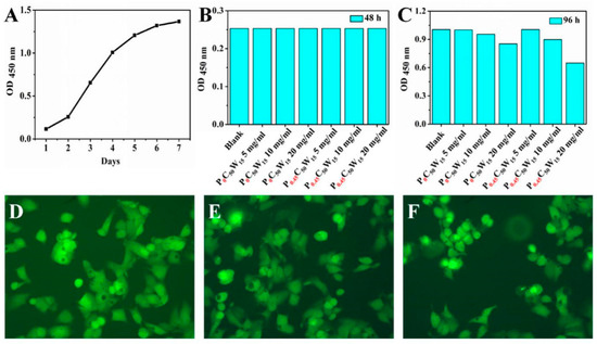 Bio-compatibility is a critical requirement for bio-materials [49]. Effects of as-synthesized Ca-BDC/P(AM-co-HEMA)HIPEs on HepG2cell proliferation are shown in Figure 11. After co-culturing with P0C50W15 and P0.45C50W15 under different dosages for 48 h, the HepG2 cells’ growths of all groups were not inhibited at all and with good growth states (Figure 11B,E,F). After further co-culturing for 96 h, the OD values of cell proliferation slightly declined, but with a good growth state. Additionally, compared to P0C50W15 without Ca-BDC, P0.45C50W15 templated from C/W HIPEs containing 0.45 g Ca-BDC show lower OD values of cell suspensions (Figure 11C), which may be attributed to that more cell grew into the larger pores of P0.45C50W15. These results show that the size of the pores and Ca-BDC contents in these Ca-BDC/P(AM-co-HEMA) HIPEs materials are vital for cell proliferation (the OD values and micrographs of HepG2cells proliferation in all groups are summarized in Table S1 and Table S2).