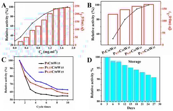 (A) Immobilizing β-amylasesintoP0.75C50W15conducted under enzyme solutions (pH = 6) with different enzyme concentration; (B) under enzyme concentration of 1.0 mg/mL (pH = 6), immobilizing β-amylases into PXC50W15 and P0C50W15; (C) the reusability of immobilized β-amylases prepared by P0.15C50W15, P0.45C50W15 and P0C50W15 under enzyme solution (1.4 mg/mL) with pH = 5; (D) the storage stability of immobilized β-amylases prepared by P0.75C50W15 under enzyme solution (1.4 mg/mL) with pH = 5.