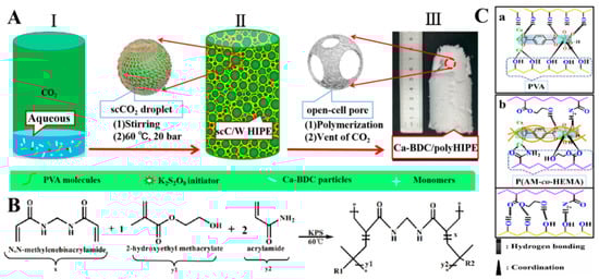 (A) Schematic illustration for the preparation of Ca-BDC/P(AM-co-HEMA)HIPEs; (B) typical radical polymerization of 2-hydroxyethyl methacrylate (HEMA), acrylamide (AM), and N,N’-methylenebisacrylamide (MBA) initiated by potassium persulfate (KPS) (x = n wt %, y1 + y2 =100 − n wt %) at 60 °C; (C) interactions between individual components in Ca-BDC/P(AM-co-HEMA) HIPEs.