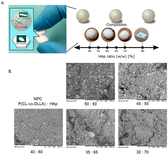 Fabrication of novel polymer carrier for pulp capping. Representative image of each HAp ratio (A). HAp ratios of 50% to 60% were good for application handling. Representative SEM images (200×) are shown (B). An HAp ratio higher than 65% could not be maintained. HAp= hydroxyapatite, NPC= novel polymer carrier for pulp capping, CL = ε-caprolactone, DLLA = d,l-lactide.