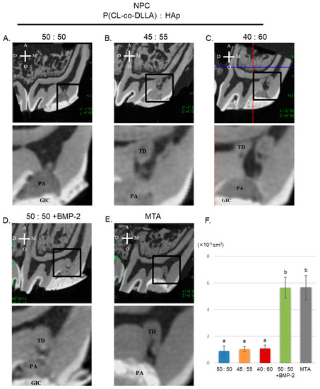 Representative micro-CT images of NPC, NPC (ratio 50:50) with BMP-2, and MTA are shown in Figure 4A–E. NPC with BMP-2 and MTA showed similar abilities in inducing tertiary dentin volume (DV) in exposed pulp tissue (F). NPC could not induce tertiary dentin in the exposed pulp area at 4 weeks.