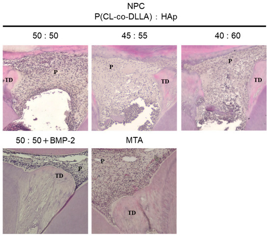 These results indicate that NPC may be an effective carrier for the pulp capping material using growth factors or biological molecules. Therefore, whether this material was effective as a carrier releasing BMP-2 exhibiting hard tissue-inducing ability was evaluated in an animal model. NPC (50:50) was combined with BMP-2 and evaluated in a rat model because of the handling convenience among NPCs (50:50, 45:55, and 40:60).