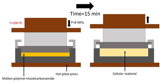 These cylindrical precursors were introduced into a special mold that can control the final density of the material [45]. The mold is subjected to both temperature and pressure in a two-hot plates press. A pressure of 8 MPa and 200 °C was applied for 15 min. After this time, when azodicarbonamide was fully decomposed, pressure inside the mold stabilized. At this point, the applied pressure was relaxed allowing the polymer to expand. The depressurization rate was 1.3 MPa/s. The mold was cooled down using cold water to stabilize the cellular structure as fast as possible. The relative density of all the produced foams was fixed in a value of around 0.62 (corresponding to an expansion ratio of 1.61). A schema of the production method with the used pressure, time, and temperature parameters is shown in Figure 1.