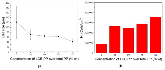 On the other hand, the quality of the cellular structure is not only measured in terms of cell size. An important parameter such as the homogeneity of the cellular structure can be quantified using the standard deviation of the cell size distribution, (Equation (3)). The values for this standard deviation have been presented in Figure 3 as error bars. It can be seen that this standard deviation is clearly reduced (homogeneity of the cell size distribution is improved) when the content of LCB-PP is increased.