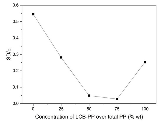 For this case, the high variation of cell size between the different materials (121 μm in the higher case and 43 μm in the lower: almost three times lower) makes more appropriate the use of SD/ϕ parameter to compare between them. As can be seen in Figure 4, there is a clear reduction (20% reduction) of this parameter when foams with LCB-PP contents higher than 50% are produced. This indicates that the addition of significant amounts of LCB-PP is also accompanied by the generation of narrower (more homogeneous) cell size distributions, as it was to be expected, because of the higher melt strength of this kind of polypropylene.