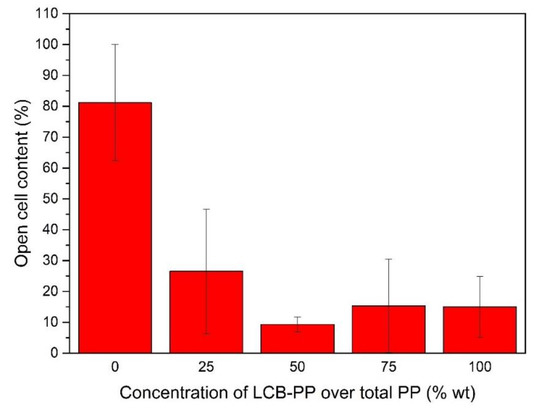 The open cell content was measured for the different compounds, obtaining the following graph (Figure 5). As can be seen, a higher open cell content was observed for L-PP. This was expected: the low strain hardening of L-PP led to a higher cell rupture process. This was seen by Laguna-Gutierrez [46]. According to LCB-PP increment, the open cell content was sensibly lower reaching a minimum value for the 50% LCB-PP foam. This parameter was directly related with mechanical properties as Laguna-Gutierrez observed [49]. The compound with the lower value (50% LCB-PP) also showed the minimum SD/ϕ value in Figure 3, being the material with better cellular structure.