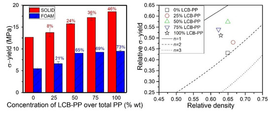 Stress at yield of solids samples and foams (left) and relative stress at yield of foams in the scale model representation (right). The percentages in the left graph indicate the percentage of improvement with respect to the 0% LCB-PP compound value, for solids (red) and foams (blue).