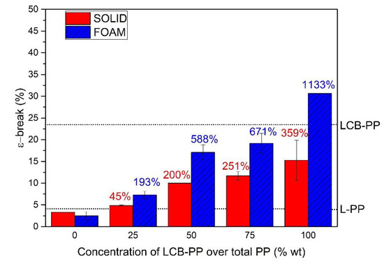 Strain at break of solids samples and foams. The strain at break of the raw used polypropylene is indicated by dotted lines. The percentages in the right graph indicated the percentage of improvement of this sample with respect to the 0% LCB-PP compound value, for solids (red) and foams (blue).