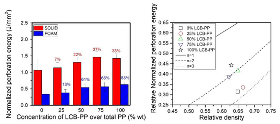 Paying attention to the scale model representation (Figure 9-right), the obtained values could be considered good results because the usual values followed by impact resistance related parameters in this type of representations for foams tend to be significantly worse, following the trend n = 4 [25,40], instead like in this case, where the best foams follow trends with n lower than 2. The foams with an intermediate level of LCB-PP were closer to the respective solid property, compared with the extreme compositions.