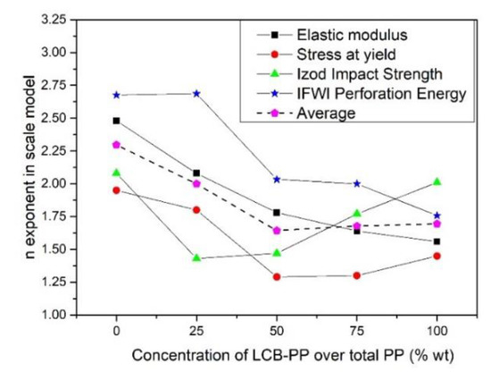 For foams, the results obtained are remarkable, not for the achieved absolute values but for the extremely good relative property that they all exhibit. The absorbed energy by the foams was increased with the addition of LCB-PP in a higher percentage than the solids (the 100% LCB-PP foam was 88% better than 0% LCB-PP foam). The enhancement of cellular structure seems to play a key role in the improvement of the impact resistance of the foams. The evidence of this reasoning can be observed in the scale model in Figure 10-right: the exponent in the scaling law for these materials is close to the trend n = 2, and it is lower for formulations with a higher content of LCB-PP (higher than 50%).