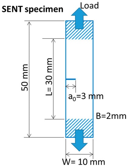 The experimental procedure, described in detail in [], is a single specimen procedure developed to obtain the fracture resistance of rubber mode I condition, and is based on the J-integral parameter []. The procedure is summarized here: Single Edge Notched in Tension (SENT) specimens, shown in Figure 1, are used, with the following dimensions: width W = 10 mm, clamps distance L = 30 mm, thickness B = 2 mm, notch length a0 = 3 mm. SENT specimens were tested at 10 mm/min of crosshead rate. During loading, the load- crosshead displacement curve was monitored. J-integral values at the fracture initiation point, Jc (kJ/m2) values, were calculated by Equation (2):