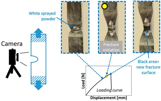 Experimental setup for fracture test: camera in front of the notch root, example of frames taken during a fracture test with the notch surfaces of a specimen. In particular, fracture initiation is indicated.