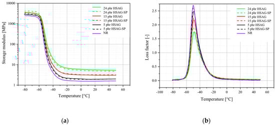 Dynamic mechanical analysis of vulcanized NR-based composites containing either HSAG or HSAG-SP (a) Storage modulus deviation versus temperature; (b) Loss factor deviation versus temperature.